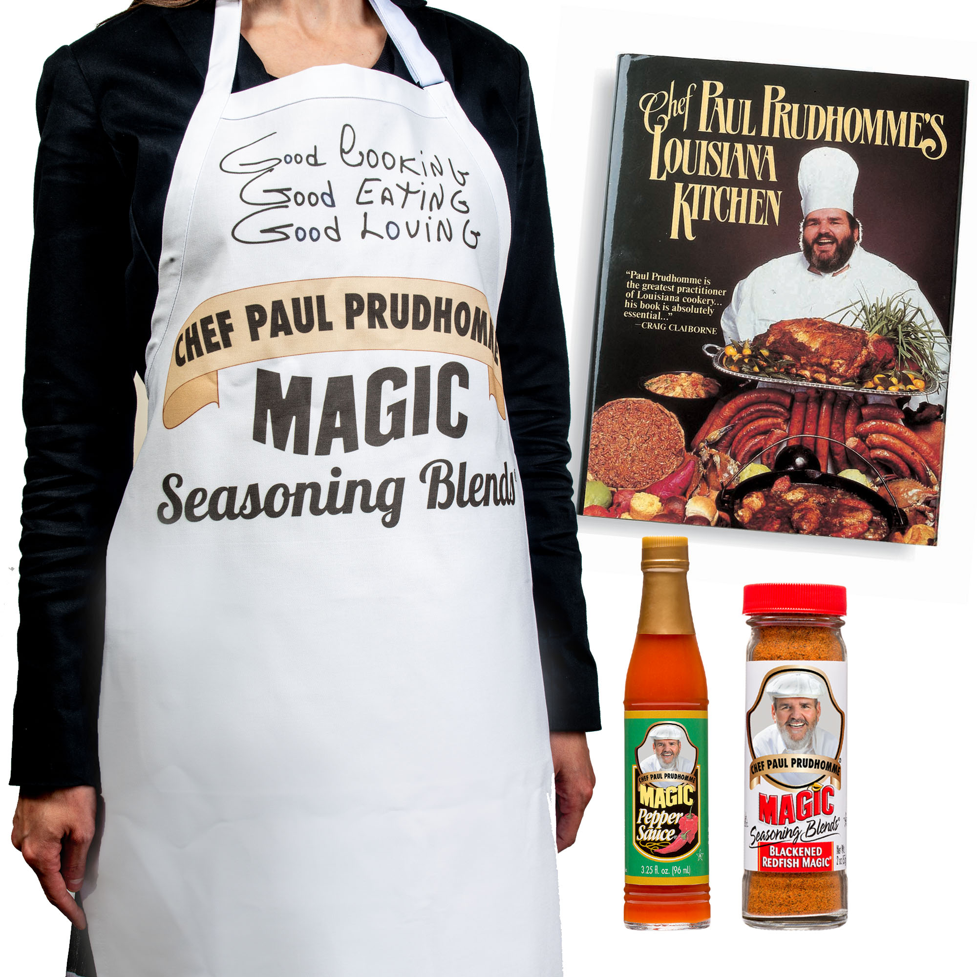 - 1 Magic Seasoning Blends apron featuring Chef Paul’s iconic tagline, “Good Cooking! Good Eating! Good Loving!”