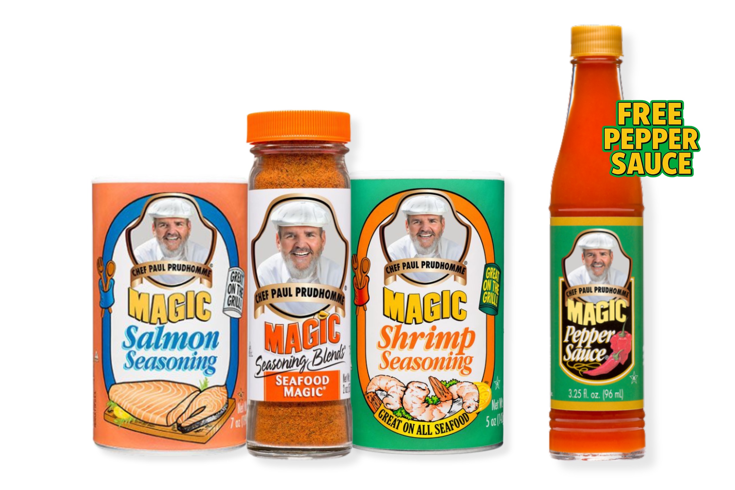 Get all three seafood blends — Seafood Magic®, Salmon Magic®, and Shrimp Magic® – bundled together for just $7.95, and enjoy a little lagniappe: a free Magic Pepper Sauce included with every order. while supplies last.